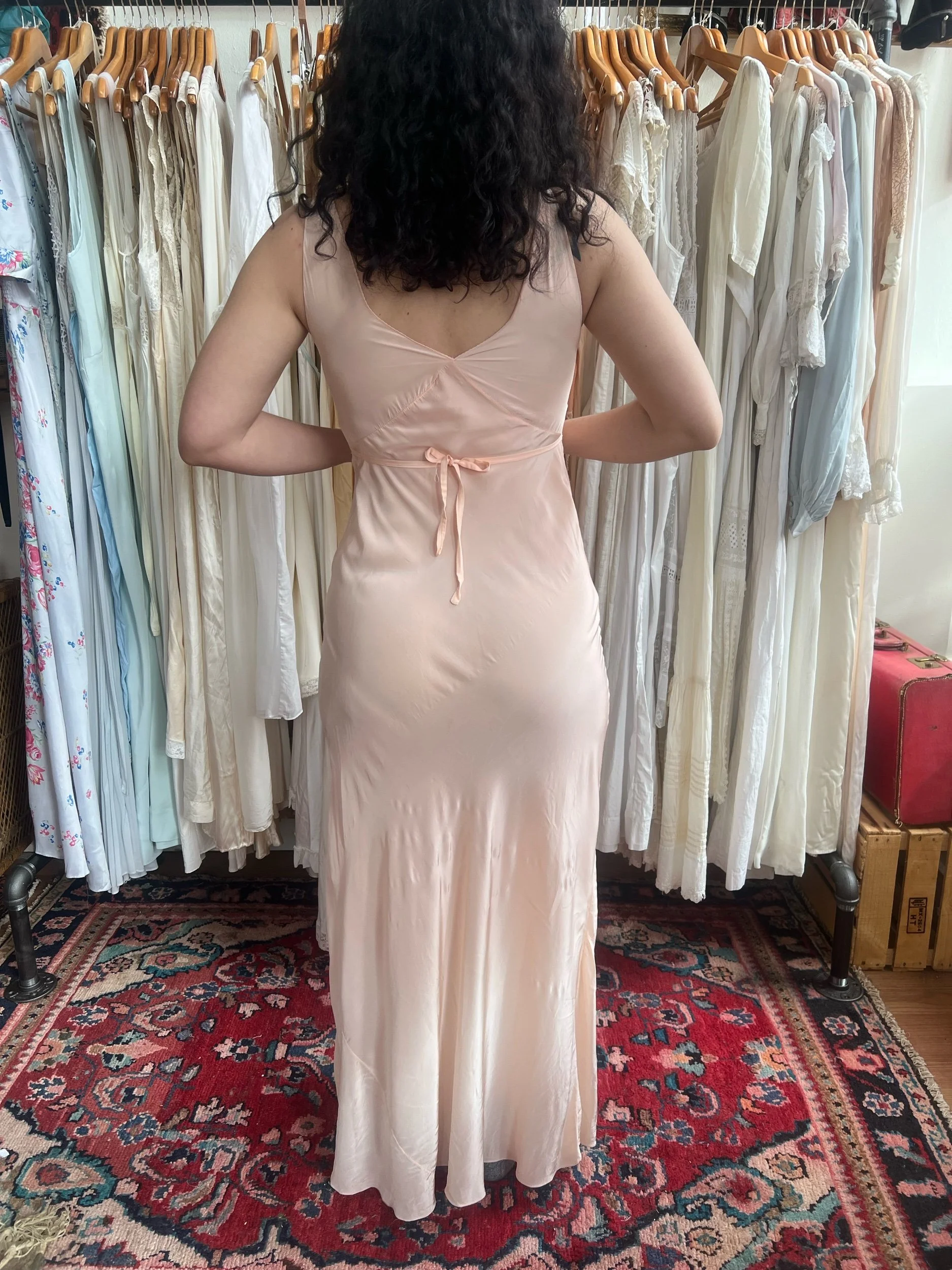 condition: excellent. minor brown splotch towards hem a few tiny pin holes